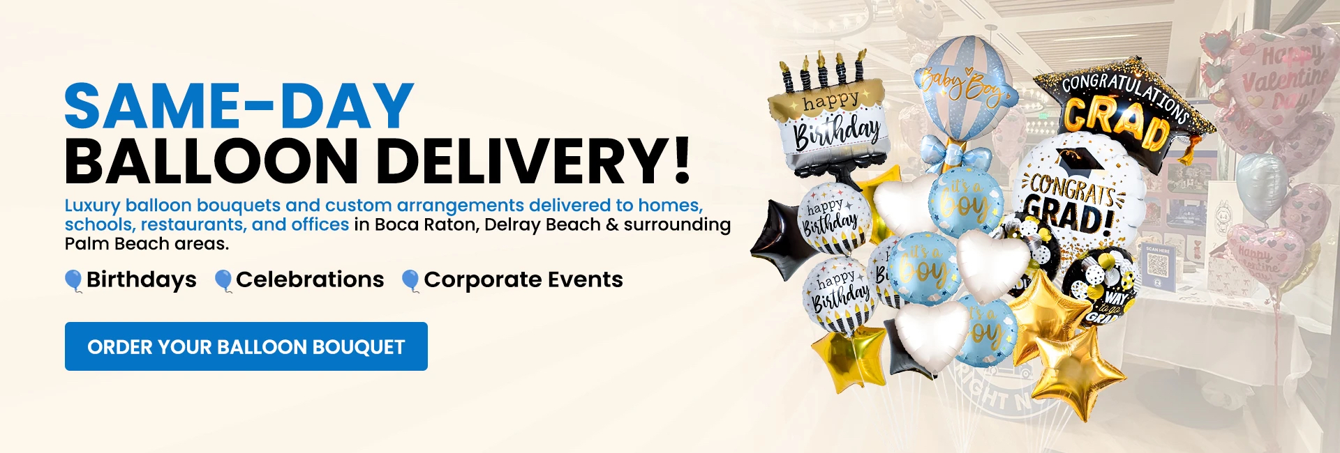 Need balloon delivery in Boca Raton today? Our local Boca Raton balloon shop delivers fresh helium balloons, balloon bouquets and party balloons across Boca Raton and Delray Beach. Perfect for birthdays, baby showers, school events and surprises. Fast same day delivery to homes or venues with bright, ready to celebrate balloon designs people love.