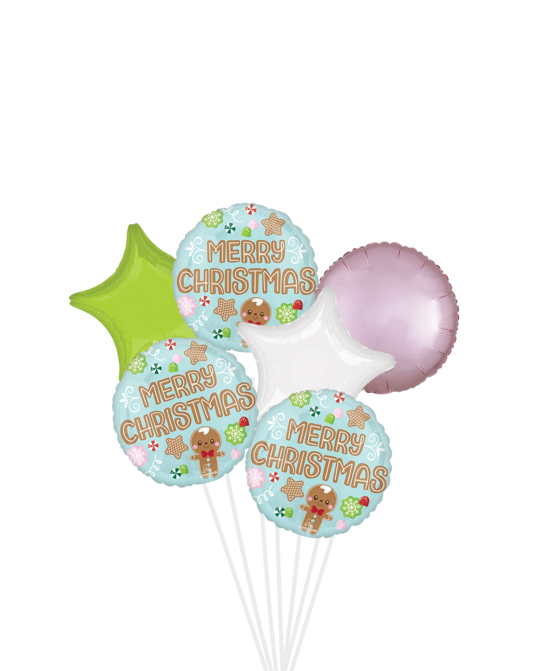 • 3 “Merry Christmas” gingerbread-themed round balloons