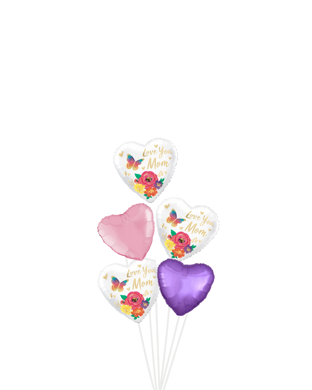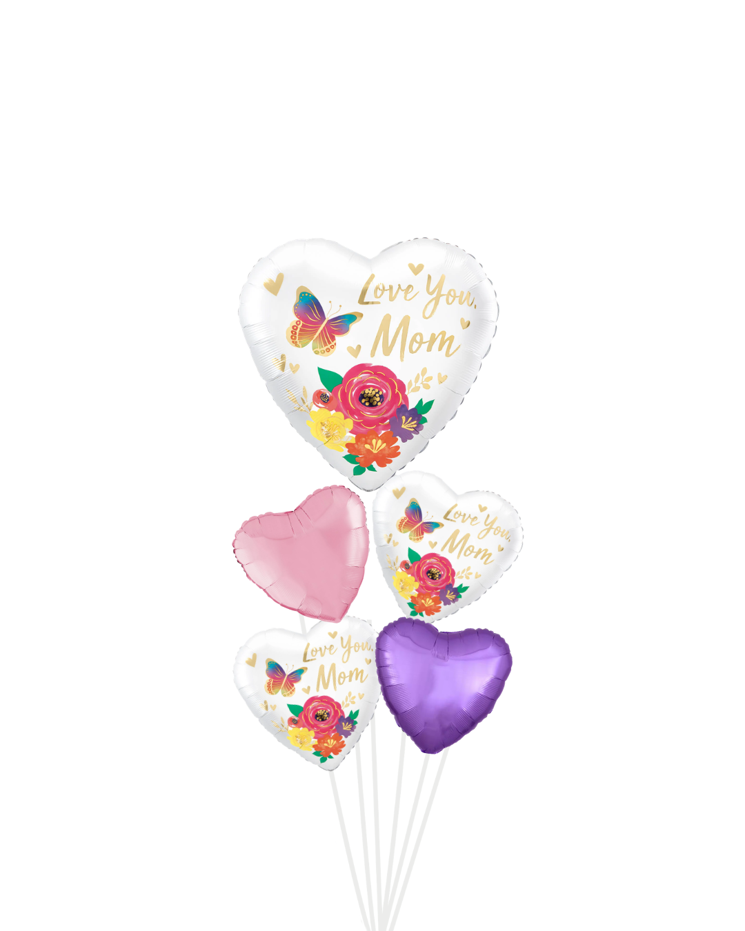 Elegant and timeless, this Mother’s Day balloon bouquet features a beautiful “Love You Mom” heart design accented with vibrant florals and a delicate butterfly motif, paired with soft metallic heart balloons in coordinating colors.