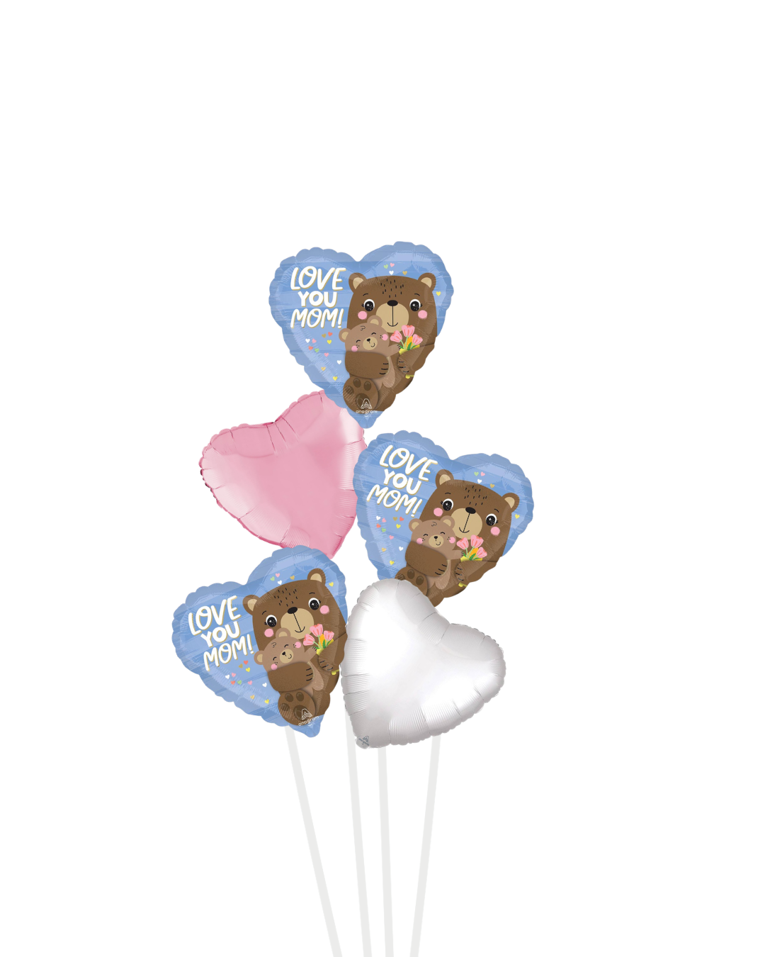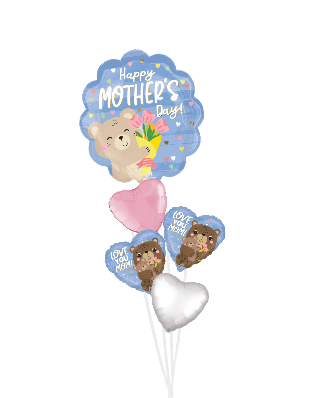 Sweet, heartfelt, and perfect for making Mom smile—this Mother’s Day balloon bouquet features an adorable teddy bear design holding flowers, paired with soft pastel heart balloons and “Love You Mom” accents.