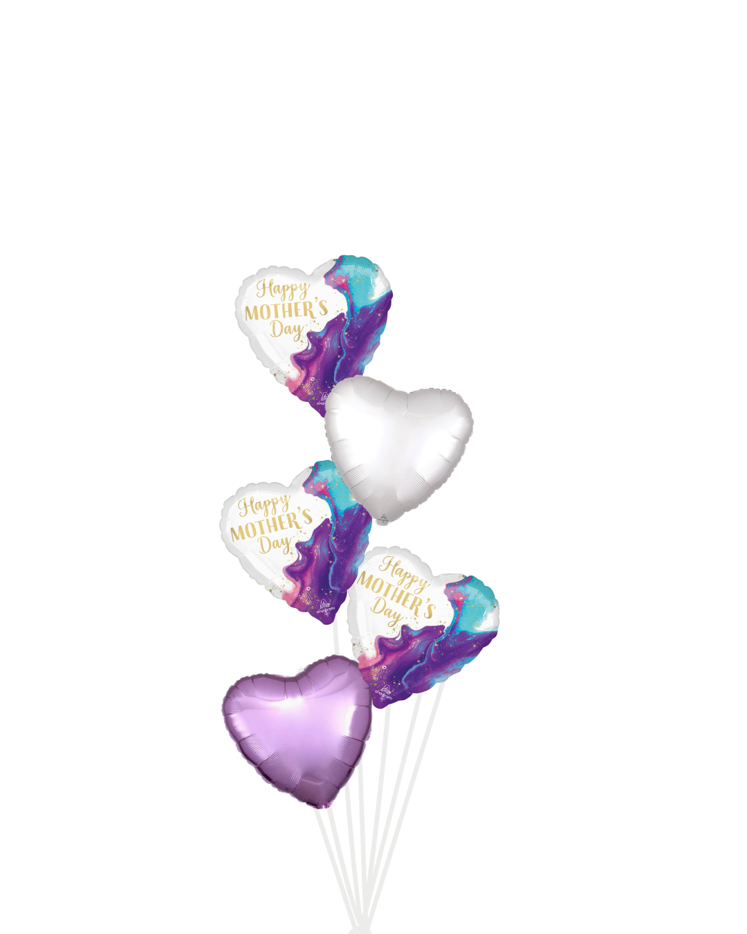 Celebrate Mom with a refined, modern take on a classic gesture. This Mother’s Day balloon bouquet features premium heart-shaped foil balloons in soft metallic lavender and pearl white, paired with “Happy Mother’s Day” statement balloons in a luxe watercolor design.