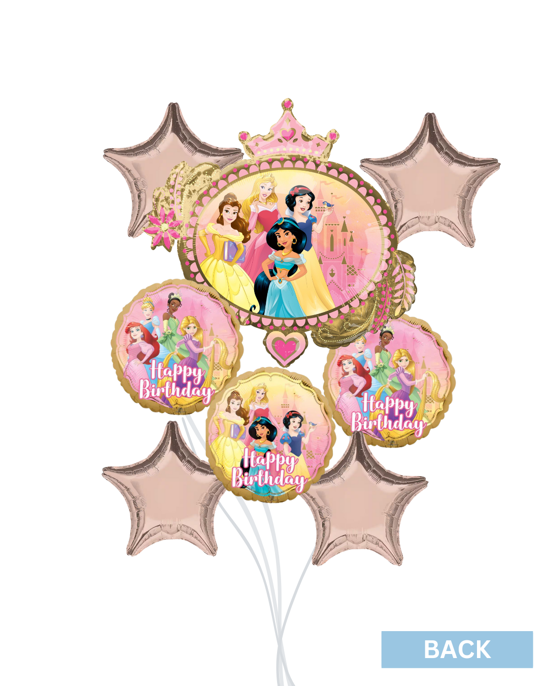 This enchanting balloon set features a stunning 34” royal-themed centerpiece balloon with a group of elegant storybook princesses, showcasing familiar faces in dazzling gowns. It’s paired with three 18” round balloons that say “Happy Birthday” and include the full royal crew—some front and center, others peeking from the back—plus two rose gold star-shaped balloons (19”) to tie it all together. See images to view the front and back of the balloon arrangement.Perfect for little dreamers who adore magical castles, glittering gowns, and happily-ever-afters.