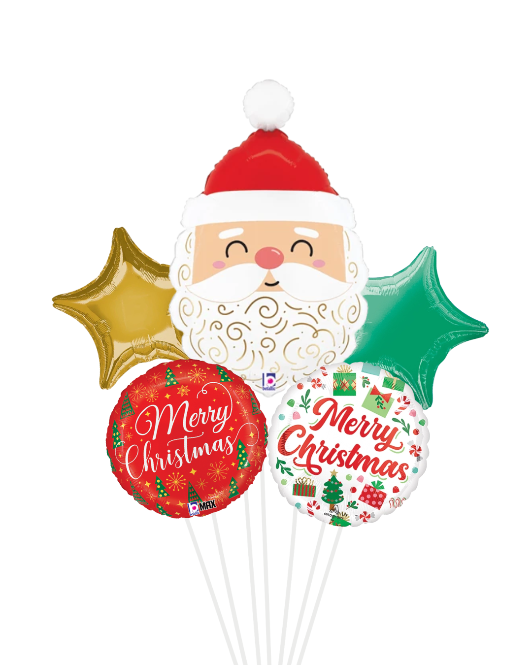 Brighten the holidays with this joyful Santa Christmas Balloon Bouquet! Featuring a cheerful jumbo Santa balloon and festive “Merry Christmas” foils in classic red, green, and gold, this arrangement brings instant Christmas magic to any celebration.