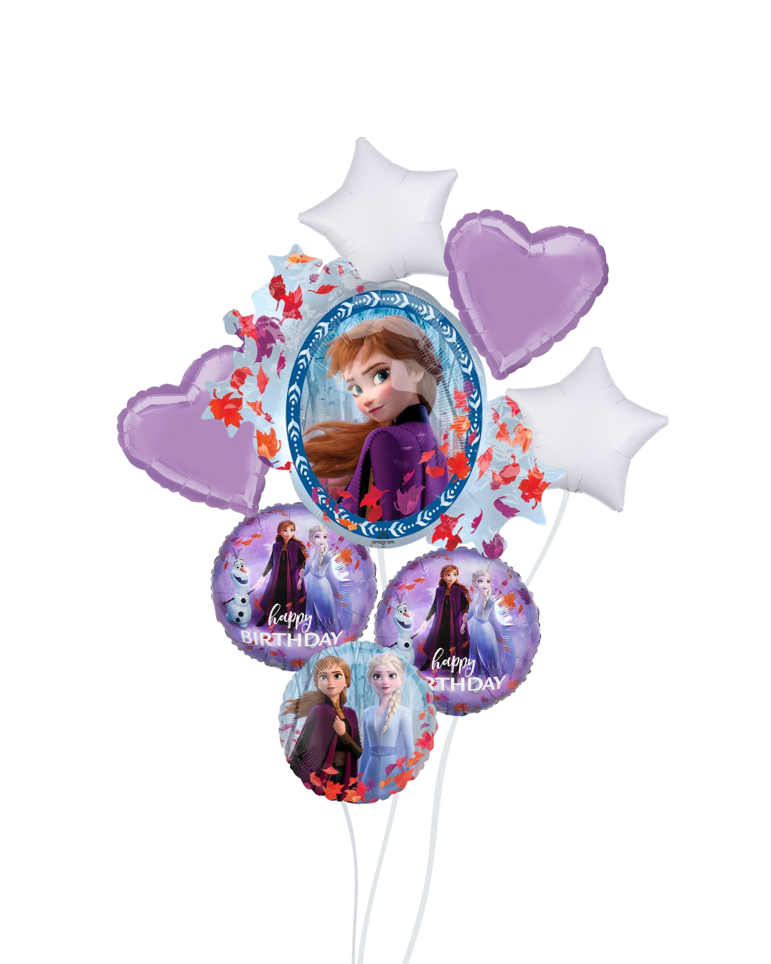 The set also includes two 18” round balloons showing the beloved sister duo holding hands with a cheerful snow friend, along with a third 18” balloon displaying both the sisters and their frosty companion (front and back have different characters as well – see images). With “Happy Birthday” messages and a cool color palette of icy blues and purples, this bundle is perfect for fans of magical adventures, sisterly love, and snowy kingdoms.
