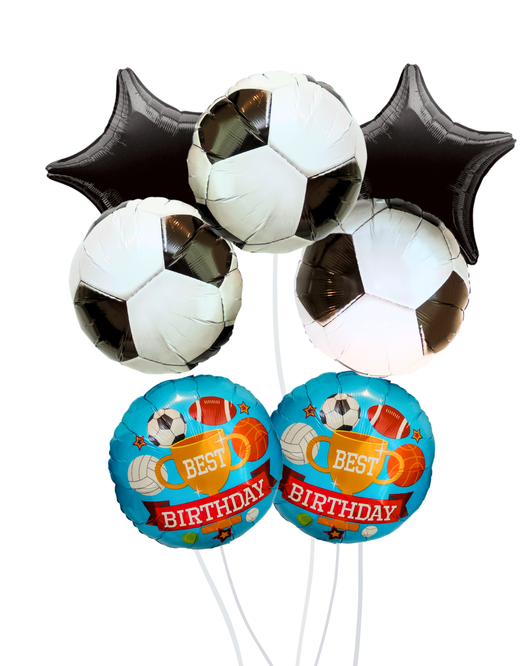 - Elite Elegance: three round 18-inch soccer ball balloons and two sport-ball and trophy themed round 18-inch balloon with text ‘Best Birthday’.